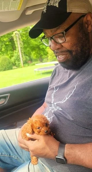 “The last thing I thought I would be doing today was driving down state to pick up a new dog. This is definitely my husband's dog! Meet Ramsey everyone. #FrankReliford and Poodlepupswithprincipalpuppies, you did it again! Ramsey's personality is just like Teddy's, chill. We love him already.”